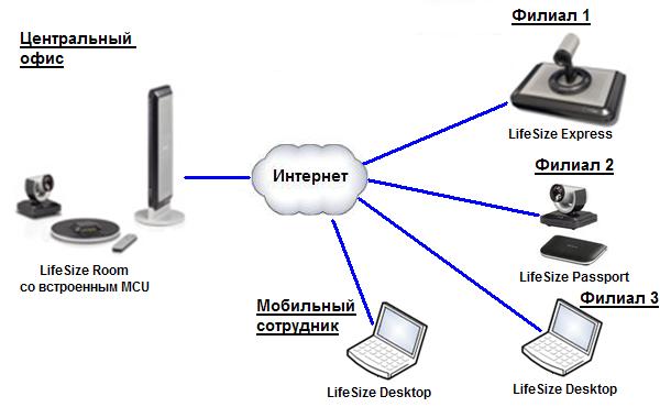 В каждом из офисов устанавливается по одному терминалу видеоконференцсвязи, например, LifeSize Passport, LifeSize Express или ноутбук (компьютер) с программой LifeSize® Desktop™. В центральной точке устанавливается MCU (Multipoint Conference Unit или видеосервер), который и обеспечивает прием видеопотоков и звука от каждого из участников видеоконференции и формирует результирующий поток, который рассылается всем участникам видеоконференции.